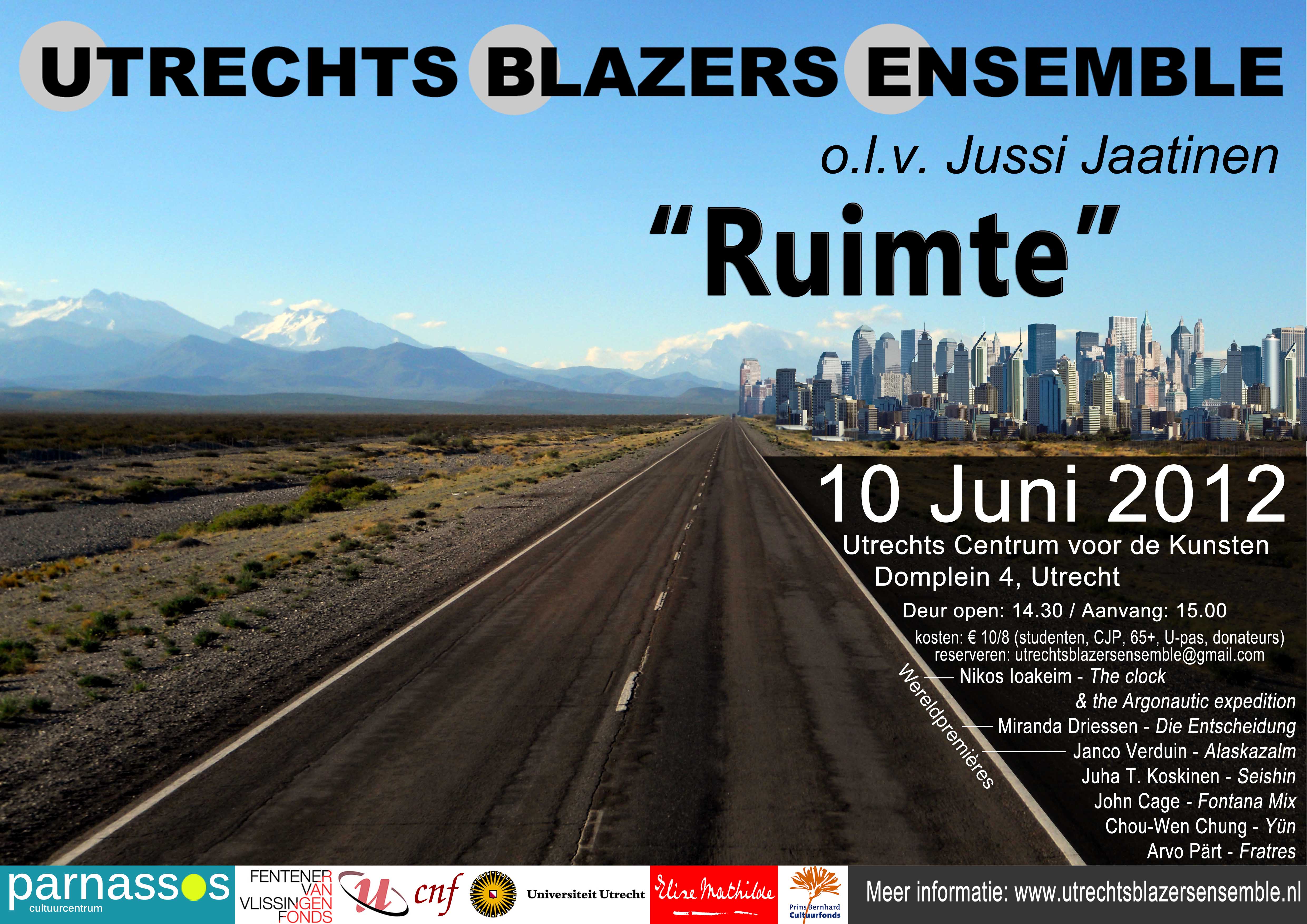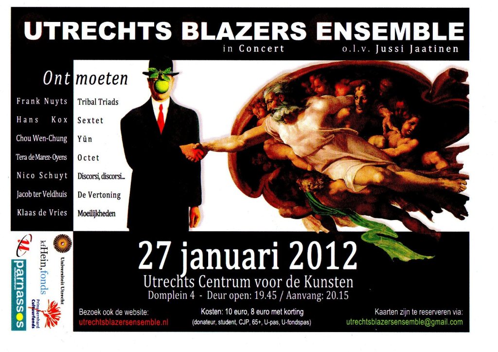 27/01 20:15 Utrechts Centrum voor de Kunsten, with the UBE led by Jussi Jaatinen works of De Vries, Nuyts (première), Schuyt, Kox, Ter Veldhuis